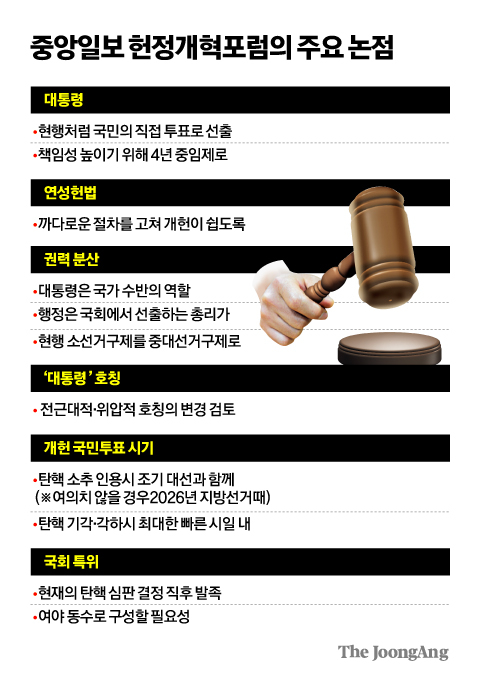 윤석열 대통령의 계엄 선포와 이후 펼쳐진 탄핵 정국은 대한민국 정치사의 중대한 변곡점이다. 모든 국민이 공유한 이 초유의 사건을 국가적 분열과 혼란의 기억으로만 남기느냐, 아니면 국가 재도약의 기회로 반전시키느냐는 우리 국민과 정치인의 몫이다. 중앙일보 헌정개혁포럼은 이런 문제의식에서 발족됐다. “앞으로 어떤 인물이 집권하더라도 국가만은 안정적으로 운영되는 시스템을 만들어야 한다” “양 진영이 모든 레벨에서 사생결단식으로 싸우는 검투사 정치에서 벗어나지 못하면 미래는 없다”는 절박감 속에 열 차례 회의가 진행됐다. 다음은 위원들의 토론 요약.